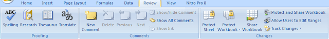 Menu review memiliki beberapa grup menu yaitu Proofing , comments dan changer . Menu review berguna untuk mengecek penulisan , translate dan melihat segala perubahan yang terjadi .